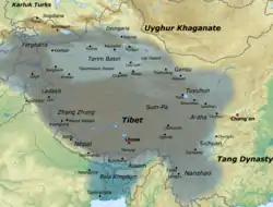 ![]() الإمبراطورية التبتية في أقصى اتساع لها في فترة عقدي 780 و 790 | |||||||||||||||||||||||||