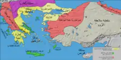 ![]() الإمبراطورية اللاتينية مع توابعها (بالأصفر) والدول اليونانية المستقلة من الإمبراطورية البيزنطية (بالأحمر) بعد معاهدة نيمفايم في 1214. | |||||||||||||||