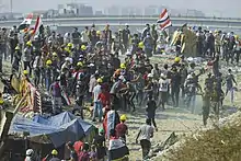 - 17 تشرين الثاني: أغلقت القوات الامنية مجموعة من الطرق في مناطق الحسينية والشعب والبياع ومناطق شرق العاصمة،[563] وتم تعطيل الدوام الرسمي في محافظات ذي قار وميسان وبابل وواسط.[564] في البصرة تم قطع طريق بغداد-البصرة والطريق المؤدي إلى تقاطع العسكري وطريق البصرة-زبير المؤديان إلى الحقول والمنشأت النفطية، وتم قطع طريق ابي الخصيب باتجاه حقل السيبة الغازي، كما تم قطع الجسر الايطالي وجسر خالد، واغلقت بعض ابواب المدارس.[565] في الناصرية مركز محافظة ذي قار توجه موظفوا الدولة وطلبة المدارس إلى ساحات التظاهر بمشاركة عدد من شيوخ العشائر، كما تجددت التظاهرات في قضاء الرفاعي في المحافظة طالب فيها المتظاهرون باطلاق سراح المعتقلين وحاولت قوات مكافحة الشغب تفريق المتظاهرين بواسطة القنابل المسيلة للدموع مما أدى لإصابة أربعة من المتظاهرين بجروح نقلوا على اثرها إلى المستشفى لتلقي العلاج.[566][567][568][569] في محافظة الديوانية أضرب طلبة المدارس عن الدوام الرسمي وتوجهوا إلى ساحات التظاهر للمشاركة في الاحتجاجات.[570] في كربلاء والنجف اضرب طلبة المدارس والجامعات وموظفي الدولة عن الدوام الرسمي واغلق اصحاب المحال التجارية محالهم للمشاركة في الاحتجاجات.[571][572] تجددت الاحتجاجات في المثنى، ونظم مسؤولون في ديوان المحافظة اضراباً تلبية لدعوى مقتدى الصدر.[573][574] أعلن مصدر أمني ان التحقيقات بشأت تفجيري ساحة التحرير في بغداد والحبوبي في الناصرية لم تتوصل إلى ما يمكن أعتباره عملاً أرهابياً وان التفجيرين يشيران إلى شبهة جنائية.[575] اطلقت قوات مكافحة الشغب القنابل المسيلة للدموع قرب جسر الشهداء لتفريق المتظاهرين هناك، وتم تسجيل 37 حالة اختناق قرب جسري الاحرار والشهداء نُقل بعضهم إلى المستشفيات لخطورة اصاباتهم.[576][577] تسجيل اصابتين بسبب سقوط ثلاث صواريخ في بغداد الأولى في نهر دجلة، والثانية قرب ملعب مقابل المنطقة الخضراء، والثالث سقط داخل حديقة شركة في منطقة الكرادة داخل.[578]