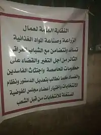 | الأسباب | البطالة والفقر فقدان وسوء الخدمات الأساسية فساد الدولة أزمة الطاقة[1] الطائفية مناهضة النفوذ الإيراني صعود تنظيم الدولة الإسلامية[2] | ||