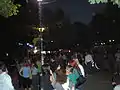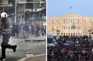 ![]() A police officer flees protestors throwing rocks; a crowd assembles peacefully in front of Parliament | |