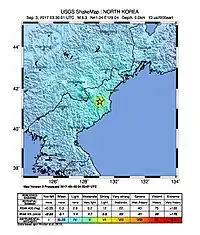 |CitationClass=تم تجاهله (مساعدة) - "North Korea's 3 September 2017 Nuclear Test Location and Yield: Seismic Results from USTC". Lianxing Wen's Geography. University of Science and Technology of China. مؤرشف من الأصل في 11 أبريل 2019. اطلع عليه بتاريخ 4 سبتمبر 2017. الوسيط