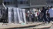 انتهت مدة السماح للمتظاهرين في الثالثة مساءً، ولكنهم حصلوا على ساعة إضافية. بعد نهاية هذه الساعة، تم تجاهل المطالبات المتتالية لتفرق من قبل أغلب المتظاهرين. قام المعلق جيفريريس بقراءة قانون الشغب للمتجمعين، وبعد 40 دقيقة، أمر شرطة مقاومة الشغب بتفريق التجمع. فقامت شرطة مقامة الشغب بذلك باستخدام الغاز المسيل للدموع والرصاصات المطاطية. فقام أعضاء اتحاد العمال بالاستلقاء ورفضوا التفرق، مما اضطرالشرطة لسحبهم بالقوة من المنطقة.