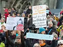 - "Germany Shocked by Cologne New Year Gang Assaults on Women" (5 يناير 2015). بي بي سي نيوز. استرجع 7 يناير 2015. نسخة محفوظة 30 يناير 2018 على موقع واي باك مشين.