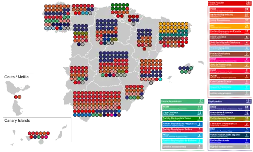 - مستقل، قوائم راديكالية منفصلة في مقاطعات قصرش وكاستيون وسبتة ومالقة وأورينسي وسانتاندير وتنريفي ولاس بالماس وقرطبة