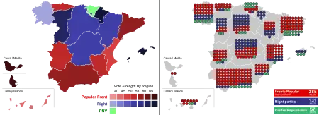 وفي يوم الانتخابات انتشر 34,000 من الحرس المدني و17,000 من حرس الاقتحام لتطبيق النظام.[13] وقُتل في ذلك اليوم سبعة وثلاثون شخصًا في حوادث مختلفة.[22] انتهى الاقتراع في 16 فبراير بالتعادل بين اليسار واليمين مع إزاحة كاملة لحزب الوسط. ولكن بدا هناك تدخل لمجموعات يسارية في عمليات التسجيل أو الاقتراع في ست مقاطعات، مما زاد من نتائج اليسار أو أبطل التعددية أو أغلبية اليمين.[23] فجرى في غاليسيا بشمال غرب إسبانيا وبتنسيق من الحكومة؛ وتلاعب اليسار السياسي أيضا في لا كورونيا. وسيطرت الحكومة على التصويت في غرناطة (وبشكل غير عادل).[24] وفي بعض القرى منعت الشرطة أي شخص لا يرتدي طوق من التصويت. وأينما كان الاشتراكيون ضعيفو التنظيم، كان عمال المزارع يصوتون حسب أوامر رؤسائهم أو زعمائهم المحليون. وبالمثل تم إقصاء بعض الناخبين اليمينيين من التصويت في المناطق الاشتراكية بقوة.[25] ومع ذلك كانت تلك الحالات نادرة نسبيًا.[26] بحلول المساء بدا الأمر وكأن الجبهة الشعبية قد فازت ونتيجة لذلك اقتحمت بعض الحشود السجون لتحرير الثوار المحتجزين هناك.[20][23]