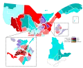 خريطة كيبيك و الألوان ترمز إلى مناطق فوز كل حزب