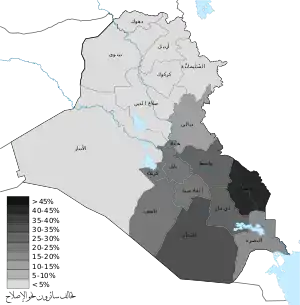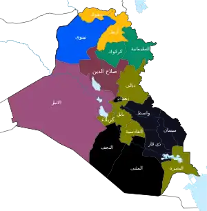 | المحافظة | بغداد | نينوى | البصرة | ذي قار | السليمانية | بابل | الانبار | أربيل | ديالى | كركوك | النجف | صلاح الدين | دهوك | كربلاء | القادسية | واسط | ميسان | المثنى | الأقليات | المجموع |