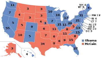 | خريطة تظهر نتائج الإنتخابات الرئاسية. الأزرق يشير إلى الولايات التي فاز بها أوباما وبايدن، الأحمر يشير إلى الولايات التي فاز بها مكين وبالين. والأرقام تشير إلى عدد أصوات المجمع الإنتخابي التي فاز بها كل مرشح عن كل ولاية | ||||||||||||||||||||||||||||||||||||||||||