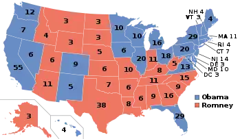 | أصوات المجمع الانتخابي حسب الولاية. اللون الأزرق هي ولايات ربحها باراك أوباما. اللون الأحمر هي ولايات ربحها ميت رومني. | ||||||||||||||||||||||||||||||||||||||||