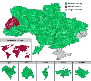 | نتائج الجولة الثانية حسب الدائرة الانتخابية فولوديمير زيلينكسي بترو بوروشنكو الانتخابات لم تعقد بسبب الحرب في دونباس أو ضم الاتحاد الروسي للقرم | |||||||||||||||||||||||||