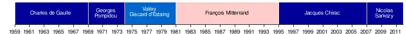 - جاك شيراك : 17 مايو 1995 - 16 مايو 2007 : رئيس منتخب بنسبة 52,63% من الأصوات. وقد حكم لفترة رئاسية ثانية بعد حصوله على 82% من الأصوات امام جون مارى لوبن في 5 مايو 2002.