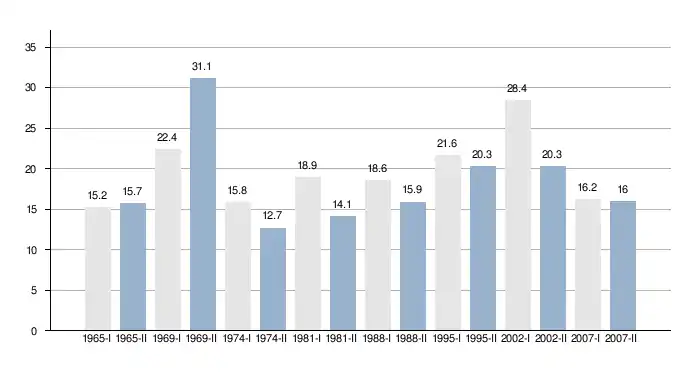 نسبة الامتناع باللون الرمادي خلال الدور الأول وباللون الأزرق خلال الدور الثاني خلال الانتخابات الفرنسية في ظل الجمهورية الفرنسية الخامسة