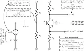 تتألف الدارة من عدة عناصر تعمل مجتمعة لتحقق دارة مضخم بتوصيل باعث مشترك أو باعث مؤرض كما يظهر في الرسم التوضيحي، فتتوضع المكثفة C بعد منبع الأشارة على الفور وذلك لكي لا تؤثر الإشارة التي يجب تضخيمها (الصادرة عن المنبع المتناوب vin) على تيارات وكمونات الأستقطاب، فيتوجب توصيل هذه الإشارة إلى القاعدة عن طريق مكثفة كبيرة السعة C تدعى مكثفة الربط من شأنها أن تؤدي دور دارة قصيرة في حالة تواترات الأشارة المفيدة جميعها، في حين أنها تعيق التيار المستمر (النظام السكوني)[1]، أما المقاومتان R1 و R2 فتعملان على تجزيئ الكمون المستمر بين وصلتي (قاعدة_باعث) و(قاعدة_مجمع) ليحقق نمط التشغيل الفعال للترانزستور.