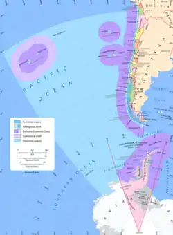 - المنطقة الاقتصادية الخالصة: تمتد من 188 ميلًا بحريًا خارج خط البحر الإقليمي. وهناك تتمتع الدولة الشيلية بحقوق حصرية في استكشاف واستغلال وحفظ وإدارة الموارد الحية وغير الحية للمياه التي تغمر قاع البحر وقاع البحر وتربة الأرض. بعد حملة قوية من المجتمع المدني بقيادة منظمة السلام الأخضر وغيرها من المنظمات غير الحكومية البيئية، ومصايد الأسماك الحرفية، ثُبت بموجب القانون أن هذه المنطقة بأكملها هي "المنطقة الحرة لصيد الحيتان"، أي أنه لا يمكن القيام بصيد الحيتان، والذي يسمح بمراقبة وإنقاذ وإعادة تأهيل أنواع الحيوانات المختلفة. تشمل المساحة الإجمالية للمنطقة ما قدره 3.681.989 كم².