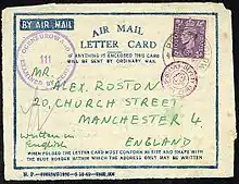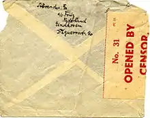 ملصق رقابة بريطاني على رسالة أُرسلت في أواخر عام 1939 من هولندا إلى فلسطين (ثم تحت الانتداب البريطاني)