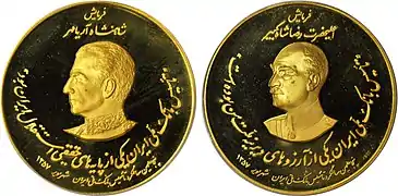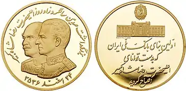 ميدالية ذهبية من البنك الوطني الإيراني بمناسبة مرور خمسين عامًا لتأسيس إمبراطورية بهلوي