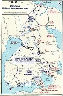 خيضت حرب الشتاء على ثلاث مراحل: التقدم السوفييتي الأولي، وهدوء مؤقت، ثم تجدد الهجوم السوفييتي. خيضت الحرب بشكل أساسي في ثلاث مناطق. كان البرزخ الكاريلي ومنطقة بحيرة لادوغا محور التركيز الرئيسي للمجهود الحربي السوفييتي. حصل هجوم مزدوج المحاور، إذ اشتبك أحد فكي الكماشة العسكرية (تكتيك عسكري) مع القوات الفنلندية على البرزخ، بينما دار الطرف الآخر من الكماشة العسكرية حول بحيرة لادوغا في محاولة لتطويق المدافعين. كانت هذه القوة آنذاك للتقدم إلى مدينة فييبوري والاستيلاء عليها. كانت الجبهة الثانية في وسط كاريليا، حيث كانت تتقدم القوات السوفييتية إلى مدينة أولو، قاسمةً البلاد إلى نصفين. أخيرًا، حدث تقدم جنوبي من الشمال للاستيلاء على منطقة بيتسامو. وبحلول أواخر ديسمبر، توقفت الجبهتان الرئيسيتان بسبب هجوم الفنلنديين عكسيًا بقوة أكبر وعجز السوفييت عن التقدم. مع فشل اثنين من هجماته الثلاث بنهاية ديسمبر، أمر المقر السوفييتي بوقف العمليات. بحلول 27 ديسمبر، لوحظ أن القوات السوفييتية كانت تحفر الخنادق في البرزخ الكاريلي.[9] من ناحية أخرى، في الشمال، دُفع الفنلنديون للتراجع إلى ناوتسي بوجود تعزيزات متحصنة في منطقة عليا لوقف التقدم السوفييتي جنوب بيتسامو. خلال هذه الفترة، من المعروف أن الفنلنديين ضايقوا أرتال الإمداد وشنّوا غارات على المواقع السوفييتية المحصنة. عقب ذلك فترة هدوء في يناير 1940، مع إعادة تقييم الجيش السوفييتي استراتيجيتَه، وإعادة تسليحه وتزويده بالإمدادات. بدأت المرحلة الأخيرة في فبراير 1940 بقصف مدفعي كبير بدأ في اليوم الثاني من الشهر واستمر حتى الحادي عشر منه، مصحوبًا بمداهمات استطلاعية على أهداف رئيسية. بدأ السوفييت باستخدام معدات وعتاد جديد، وأيضًا استخدام تكتيكات تناوب القوات من الاحتياطي إلى الجبهة الأمامية، وممارسة الضغط باستمرار على المدافعين الفنلنديين. بدا أن الجيش الأحمر لديه كميات لا تنضب من الذخيرة والإمدادات، إذ كانت الهجمات مسبوقةً دائمًا بوابل من النيران، ومتبوعةً بهجمات جوية ثم تحركات القوات العشوائية ضد الخطوط. رأى القادة العسكريون والحكوميون الفنلنديون أن الحل الوحيد المتبقي هو التفاوض على معاهدة سلام مع موسكو.[10][11][12][13][14][15][16][17]