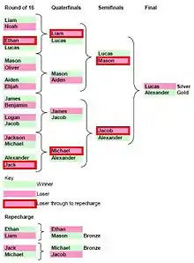 بالنسبة للمنافسة الأولمبية، هناك جولة إقصاء واحدة (خروج المغلوب) لكل فئة من فئات الوزن. سيحصل الفائز بنهائي البطولة على الميدالية الذهبية، وسيحصل الخاسر على الميدالية الفضية بينما ستجرى مسابقة ملحق لمركز الميدالية البرونزية.