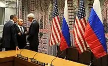 في خريف عام 2015؛ وقّعت إيران على مضض على خارطة طريق استنادًا إلى مؤتمر جنيف الثاني للسلام والذي تم التوصل إليه خلال جولتين من محادثات السلام في فيينا. بعد اللقاء بين فلاديمير بوتين وعلي خامنئي في طهران في 23 تشرين الثاني/نوفمبر 2015؛ تمثل قرارُ إيران بالأساس في توحيد موقفها تجاه القيادة السورية معَ روسيا حليفة الأسد.[20]
