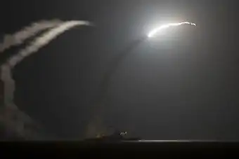 ![]() صواريخ توماهوك تطلق من السفن الحربية يو إس إس بحر الفلبين ويو إس إس أرلي بيرك على أهداف لداعش في مدينة الرقة | |||||||