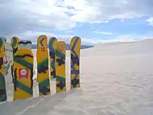 و يكون التزلج عبر منحدرات الكثبان الرملية حيث تكون أقدام المتزلجين مربوطة بألواح التزلج ، بينما يفضل بعضهم استعمال ألواح بدون رباط .