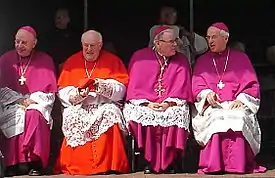 الكرادلة هم أمراء الكنيسة المعينين من قبل البابا[32] لرئاسة إحدى دوائر الإدارة البابوية أو للقيام بالمهام الأسقفية في العالم. ككل، يشكل مجموع الكرادلة ما يعرف بمجمع الكرادلة التي تقدم النصح والإستشارة للبابا. ويقوم الكاردينالات الذي لا يتجاوز عمرهم الثمانون بانتخاب البابا الجديد عندما يخلو الكرسي البابوي بسبب الوفاة أو الاستقالة.وهم يرتدون القبعة والثوب الحمروين للدلالة على معنى الإستشهاد في الكنيسة.