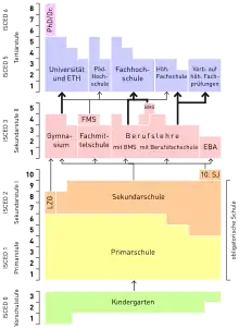 السن الأدنى لدخول المدرسة الابتدائية هو 6 سنوات في كل الكانتونات ما عدا أوبفالدن (5 سنوات وثلاث أشهر). بعد المدرسة الابتدائية يتم توجيه التلاميذ حسب قدراتهم ورغباتهم. أكثر من 20 من المائة من التلاميذ يلتحقون بالمدارس الثانوية وينهون 12 عاما من الدراسة للحصول على شهادة الماتورا التي تسمح لهم بالدخول للجامعة. باقي التلاميذ يتم تقسيمهم على نوعين من المدارس أو أكثر حسب الكانتون. تختلف هذه المدارس أساسا في مدى اعتمادها على التعليم النظري أو التطبيقي. يجبر القانون جميع التلاميذ على البقاء في المدرسة على الأقل 9 سنوات.