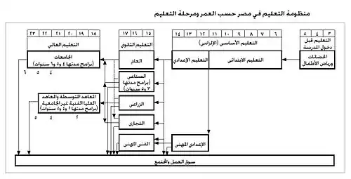 بحسب الدستور المصري، فإن التعليم مجاني وإلزامي حتى نهاية المرحلة الثانوية أو ما يعادلها بحسب القانون. وتنفق الحكومة على التعليم ما لا يقل عن 4% من الناتج القومي الإجمالي.[4][5]:16 وطبقاً للمادة 19 من الدستور امتدت مرحلة التعليم الإلزامي من 9 سنوات إلى 12 سنة اعتباراً من سن 6 سنوات إلى 18 سنة لتضم حلقة التعليم الثانوي، فيما ينص قانون التعليم الحالي على أن مرحلة التعليم الأساسي تتكون من حلقتي التعليم الابتدائي والإعدادي بإجمالي 9 سنوات. ويضم التعليم الثانوي بشكل عام طريقين للدراسة هما العام أو الفني بتخصصاته (زراعي، صناعي، تجاري، فندقي، تمريض). بعد المرحلة الثانوية لا يصبح التعليم إلزامياً، وينقسم نظام التعليم بعد ذلك إلى قسمين: التعليم فوق المتوسط لمدة سنتين دراسيتين، والتعليم الجامعي بحد أدنى 4 سنوات دراسية في الجامعات الحكومية والخاصة والمعاهد العليا، والمؤهلة للدراسات العُليا في مراحل الدبلوم والماجستير والدكتوراه بنظامين (مهني، وأكاديمي). بجانب ذلك فإن للأزهر الشريف نظاماً تعليمياً خاصاً يُدّرس فيه العلوم الدينية الإسلامية بجانب الدراسات العلمية الأخرى، والمؤهلة لما بعد التعليم الثانوي للالتحاق بجامعة الأزهر وفروعها في جميع أنحاء الجمهورية. كما ينقسم التعليم العسكري بين الكليات والمعاهد التابعة للقوات المسلحة والكليات والمعاهد التابعة لوزارة الداخلية.[6][7]