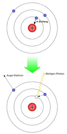 عندما يُلتقط الإلكترون من مداره في الغلاف-K من النواة فإنه يترك ورائة مكانا خاليا في الغلاف-K ولا تستطيع الذرة البقاء على هذا الحال، فيقفز أحد الإلكترونات من المدارات العليا لشغر المكان الخالي من الإلكترون الذي اصطادته النواة، ويكون ذلك مصحوبا بإصدار الإلكترون الساقط من مدار علوي لشعاع غاما.