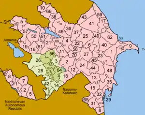 | 68 | زنغلان | Zəngilan | زنغلان | 710 | 40,500 | بحكم الأمر الوقع فهي جزء من جمهورية مرتفعات قرة باغ |