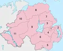 من عام 1921 إلى عام 1973 قسمت أيرلندا الشمالية إلى 6 مقاطعات إدارية ( المقاطعات قسمت إلى أحياء مدنية وريفية ) و2 بورو مقاطعة. المقاطعات وبورو المقاطعات استمر كمقاطعات تشريفية وشرفية.[2] النظام مع إبطال الضواحي الريفية بقي كهيكل للحكومة المحلية لجمهورية إيرلندا.