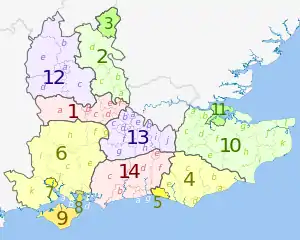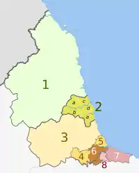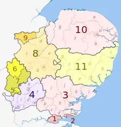 - ^C3 كومبريا وهيرتفوردشاير ونورثهامبتونشير وأوكسفوردشير وسوفك وسيري ووارويكشاير وغرب سوسكس وورتشسترشير تحتل نفس المنطقة للمقاطعة التشريفية. بوكنغهامشير وكامبريجشير وديربيشاير وديفون ودورست وشرق ساسكس وإسكس وجلوسترشير وهامبشير وكنت ولانكشاير وليستشترشير ولينكونشير وشمال يوركشاير ونوتينهامشير وسمرست وستافوردشير مناطقها أكبر من المقاطعة التشريفية ودمجت مع وحدات وحدوية.