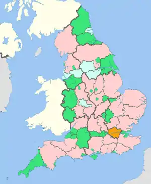 - ^D1 حضرية (36); غير حضرية ثنائية-الطبقة (201); سلطة وحدوية (55); لندن بورو (32); فريدة في نوعها (2).