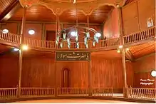 الأولى يطلق عليها مسمى «قاعة السمع خانة» أو «مسرح الدراويش»، وهو مخصص لأذكار المولويين، ويتكون من منصة خشبية مستديرة تتوسطها دائرة بلون مغاير للون المنصة ويحيط بها «درابزين خشبي» له بابان لدخول الدراويش وخروجهم قبل وبعد تأديتهم الذكر المولوي، وأما الطابق الثاني منه فهو عبارة عن سلم خشبي يؤدي إلى مساحات غير منتظمة جرى تخصصيها لجلوس الجمهور والمشاهدين، ومنها مكان مخصص للنساء يغلق عليه باب خشبي، ويحجبه عن الجمهور حجاب من الأخشاب المشكلة بطريقة التقاطع.