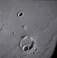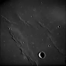 حفرة القمر كريجر والمناطق المجاورة، تظهر سلسلة التلال المتجعدة في المار المحيطة والطرق المتعرجة على طول الحافة اليسرى، من أبولو 15.