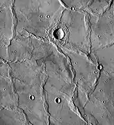 Wrinkle ridges in Hesperia Planum, Mars, as seen by Viking The wrinkle ridges go in different directions so compressional forces may have changed direction over time.