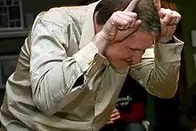 رجل يُمثل تمثيلية تحزيرية، ربما يصف بها اسم حيوان ذي قرنين.