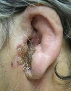 ![]() حالة مصابة بالتهاب شديد في الأذن الخارجية. لاحظ تضيق قناة الأذن, والكميات الكبيرة من النضحة, وتورم صيوان الأذن الخارجية. حالة مصابة بالتهاب شديد في الأذن الخارجية. لاحظ تضيق قناة الأذن, والكميات الكبيرة من النضحة, وتورم صيوان الأذن الخارجية. | |