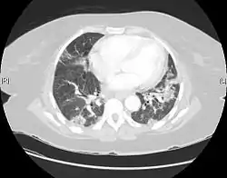 ![]() منظر لالتهاب الرئة الخلالي المعتاد تحت الأشعة المقطعية. تليف منخر يظهر في كلتي الرئتين. منظر لالتهاب الرئة الخلالي المعتاد تحت الأشعة المقطعية. تليف منخر يظهر في كلتي الرئتين. | |