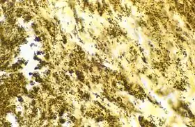 ![]() Bartonella henselae bacilli in cardiac valve of a patient with blood culture-negative endocarditis. The bacilli appear as black granulations. Bartonella henselae bacilli in cardiac valve of a patient with blood culture-negative endocarditis. The bacilli appear as black granulations. | |