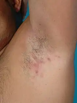 ![]() التهاب الغدد العرقية القيحي في الإبط الأيسر. التهاب الغدد العرقية القيحي في الإبط الأيسر. | |