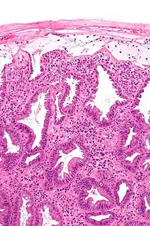 ![]() صورة مجهرية تظهر التغيرات التي ترى في التهاب القولون لنقص التروية. صبغة H&E. صورة مجهرية تظهر التغيرات التي ترى في التهاب القولون لنقص التروية. صبغة H&E. | |