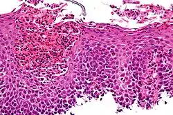 ![]() صورة مجهرية تظهر التهاب المريء اليوزيني بواسطة صبغة الهيماتوكسيلين واليوزين. صورة مجهرية تظهر التهاب المريء اليوزيني بواسطة صبغة الهيماتوكسيلين واليوزين. | |