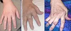 ![]() أيادي مريض متأثرة بالتهاب المفاصل الروماتویدي، أحد أمراض التهاب المفاصل والمناعة الذاتية أيادي مريض متأثرة بالتهاب المفاصل الروماتویدي، أحد أمراض التهاب المفاصل والمناعة الذاتية | |
