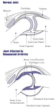 ومع تقدم مراحل المرض، يمتد الالتهاب ليؤدي إلى تآكل أربطة العضلات ونتوءها، وتدمير سطح المفصل، الذي يتسبب في تقليص مساحة حركة المفصل، فينتج عن ذلك كله تشوه شكل المفصل.