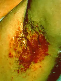 - داء المبيضات،، ويميزه التطور السريع، مع تسلخ جلد أبيض رطب مثير للحكة ومحاط ببثور ثانوية صغيرة.