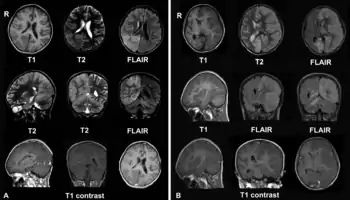 ![]() Brain CT scan of a girl with Rasmussen's encephalitis. Brain CT scan of a girl with Rasmussen's encephalitis. | |