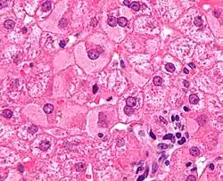 ![]() صورة مجهرية تظهر الإصابة بالتهاب الكبد ب صورة مجهرية تظهر الإصابة بالتهاب الكبد ب | |