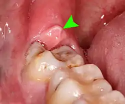 ![]() التهاب ما حول التاج مصحوب بالسن الطاحن السفلي الأيمن الثالث (سن العقل). التهاب ما حول التاج مصحوب بالسن الطاحن السفلي الأيمن الثالث (سن العقل). | |